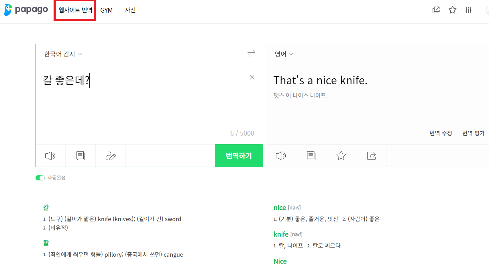 위는 파파고에 들어가면 가장 기본적으로 제공하는 문장 번역 시스템. 그런데 진짜 좋은 기능을 찾았으니 바로 웹사이트 번역! 위의 텝에서 웹사이트 번역(빨간 사각형)을 클릭하면 웹사이트를 통채로 번역해주는 웹사이트 번역 기능을 이용할 수 있다.