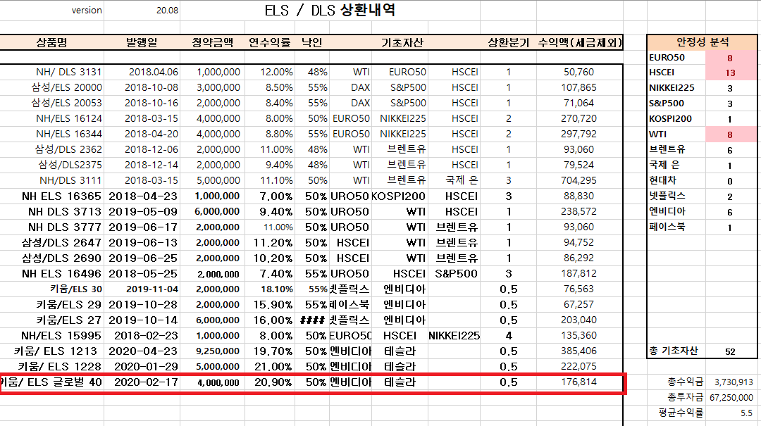 이전 글(ELS / DLS 점검(20.5.13) - 낙인보다 떨어지면??) 을 보시면 아시겠지만, 현재 코로나19 사태로 인해 원유(WTI), 테슬라, 현대차를 기초자산으로 하는 ELS/DLS 상품들이 낙인을 찍게 되었습니다. 이런 상황에서 코로나19로 인한 리스크가 아직 남아있다고 보고, 새로운 ELS/DLS 상품은 매입하지 않고, 현재 낙인을 찍고 물려있는 상품들에 대한 대응만 하고 있습니다. 현재 상태를 점검하고 앞으로의 전망을 살펴봅니다.