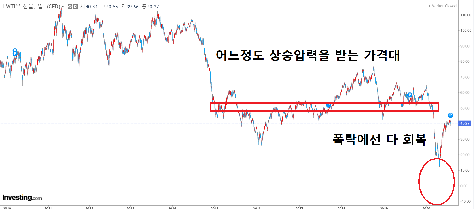 근 10년간의 WTI 가격 변화 입니다. 차트 상으론 폭락 이후 $40 선까진 회복했습니다. 또 $50 선 이하에선 꾸준히 상승압력을 받고 있기 때문에 21년까진 $50 선으로 회복하지 않을까 생각됩니다. 몇 가지 주제로 좀 더 자세히 살펴보죠.