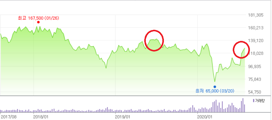 현대차의 경우 기초자산의 가격이 매입했던 4월 말쯤의 가격과 얼추 비슷한 지점까지 상승한 걸 볼 수 있습니다. 따라서 이정도 추세를 유지해준다면 곧 상환을 기대해봐도 좋을 것 같네요. 원유와 마찮가지로 이쪽도 코로나 리스크 극복이 가장 중요할 것으로 보입니다.