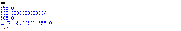 KIM = [520, 590] / PARK = [500, 580, 520] / LEE = [510, 500] / students = [KIM, PARK, LEE] 세 명의 TOEFL 점수 중에서 최고 평균점을 구하기 |