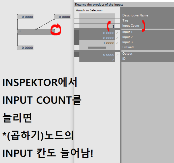 inspektor를 활용하면 *(곱하기)노드의 인풋핀의 수를 늘릴 수 있다. 위의 사진처럼, input count를 3으로 바꿔주면 3개의 인풋핀을 활용할 수 있다.