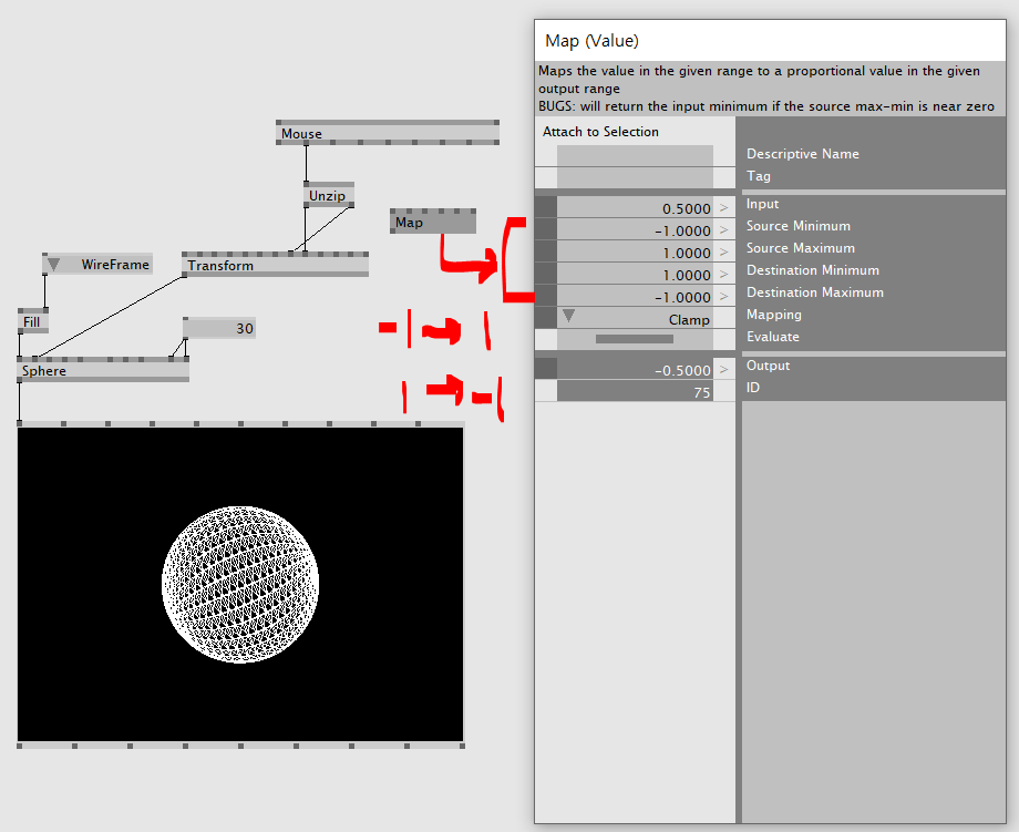 이때, 맵노드를 이용해 마우스의 x좌표 값을 1일 경우는 -1, -1일 경우는 1로 바꿔줘야 구의 회전을 더 원활하게 구현할 수 있다. 따라서 맵노드의 inspektor 값을 위와 같이 바꾼다.