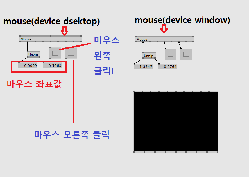 마우스 위치 값과 상태(좌,우 클릭 여부)를 나타내는 노드는 크게 2가지가 있다. Mouse(device desktop) 와 Mouse(device window) 이다. 비슷한 노드인데 차이는 한가지이다. 아래 데모영상을 보면 알 수 있듯이,