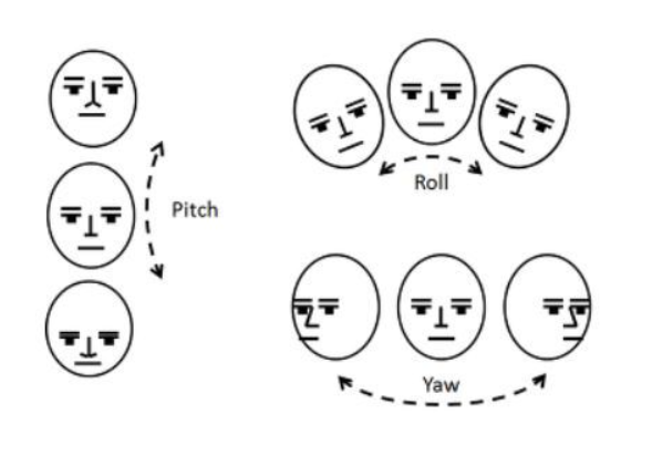 **pitch(횡방향 회전) / roll(종방향 회전) / yaw(수직방향 회전) 이다. 아래의 사진을 통해 쉽게 설명해 볼 수 있다. pitch는 고개를 위아래로 끄덕 거리는 것/ yaw는 고개를 좌우로 도리도리하는 것/ roll은 목 스트레칭할때처럼 목만 돌리는 것을 생각하면 된다.