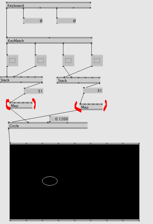 map 노드를 활용해 서로 다른 수치 값을 호환해주기만 하면 방향키에 따라 움직이는 도형을 만들 수 있다. stack 노드의 값은 0~100정도까지의 값을 가지는 반면, Circle 노드에서 좌표값의 움직임은 -1~1까지의 값을 가진다. 이렇게 서로 다른 수치 값을 가지는 경우 map 노드를 활용해 호환해주어야 한다. Map 노드는 자주 사용되는 노드이다.