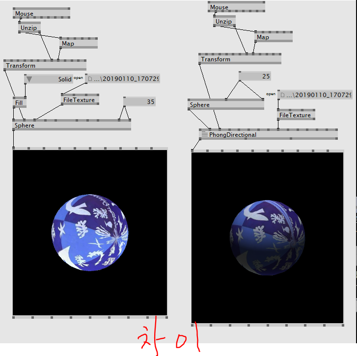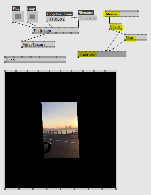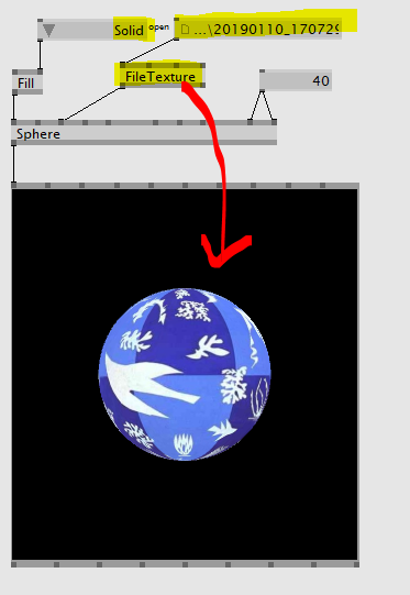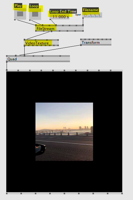 동영상을 도형 위에 덮기 위해선 Filestream(Dshow9)과 VideoTexture 노드가 필요하다. 위의 사진처럼 FileStream 노드와 VideoTexture 노드를 연결하고 인풋값들을 조절하면 도형 위에 동영상 파일을 불러올 수 있다.