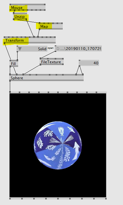 FileTexture 노드를 Sphere 노드에 연결해 이미지 파일을 구 위에 텍스처로 입힐 수 있다. 현재 구의 상태는 안에 이미지가 잘 보이게 하기 위해 Solid 상태로 구성했다. 또 Mouse 와 Transform 을 활용해 마우스의 움직임에 따라 구가 회전하도록 만들었다. 아래의 데모 영상을 통해 실제로 어떻게 기능하는지 확인해보자.