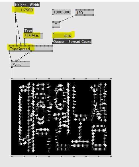 대학원노잼이라는 글자를 TypSpread 로 나타내보았다. Spread Count(스프레드 수)에 LFO 노드를 사용해 수치자 0~1000까지 계속 변화하도록 만들어 글씨가 점점 생성되는 듯한 에니메이션 효과를 줬다. 실제로 어떻게 작동하는지 아래의 데모영상을 통해 확인해보자.