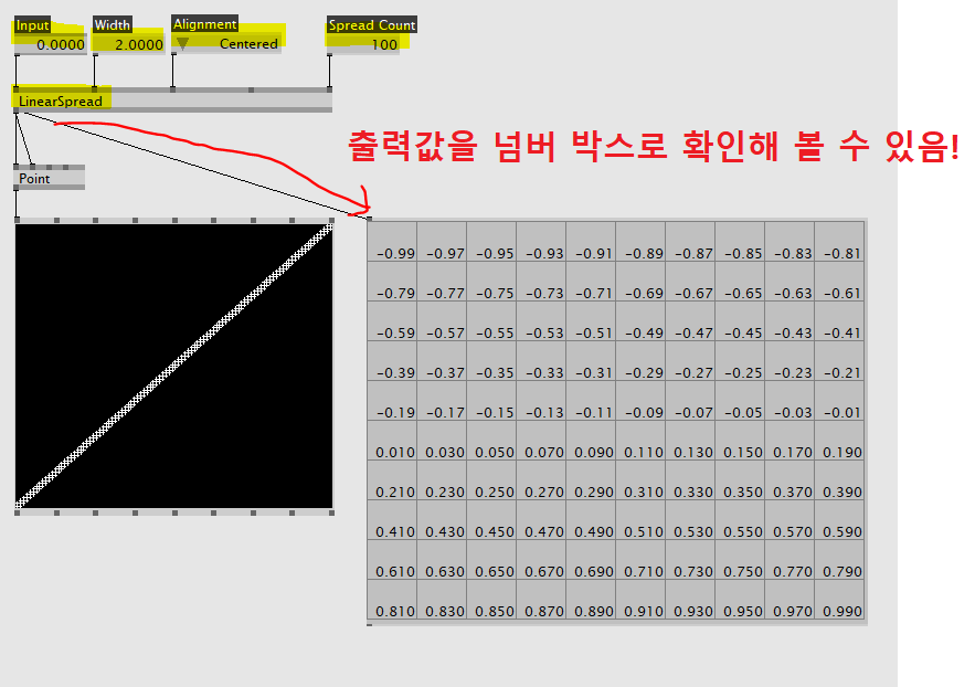 직선위의 연속적인 값을 쉽게 생성하기 위해 사용되는 LinearSpread이다. 기준점과 범위를 정하고 그 안을 채울 스프레드의 수를 정하면 그에 맞춰 동일한 간격으로 떨어져있는 수치들을 생성한다.