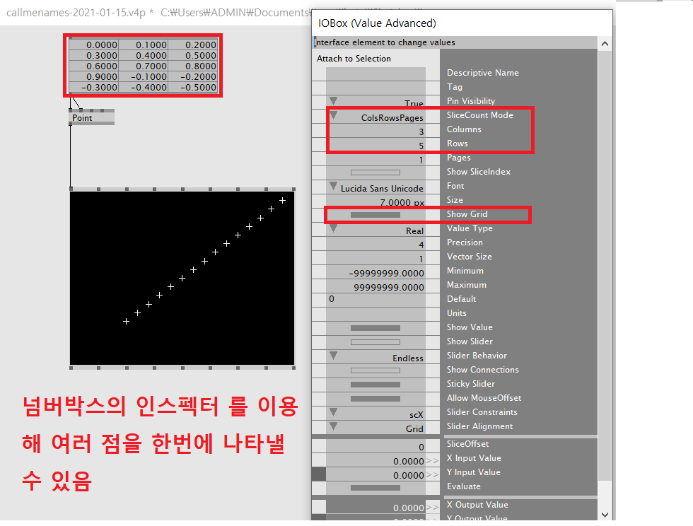 renderer 위에 연속적인 값을 갖는 수치들을 만들어 본다. 직선 위의 값 즉 연속적인 값을 만들기 위해선 넘버박스의 inspektor 를 변경해 여러점을 한번에 나타낼 수 있는 표의 형태로 바꾸고, 그 안에 일일이 데이터 값을 입력해줘야 한다. 하지만 만들고자하는 수치 값이 많을수록 너무 많은 시간이 걸리는 단점이 있다. 이런 작업을 더 빠르게 하고자 Spread 기능을 사용한다.