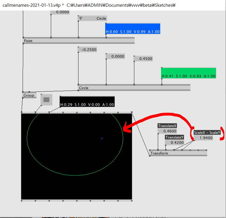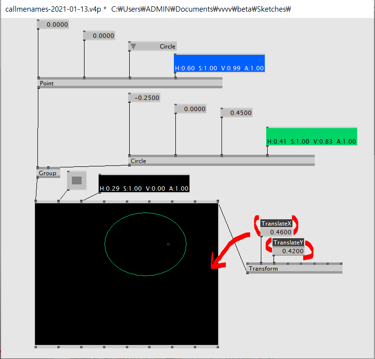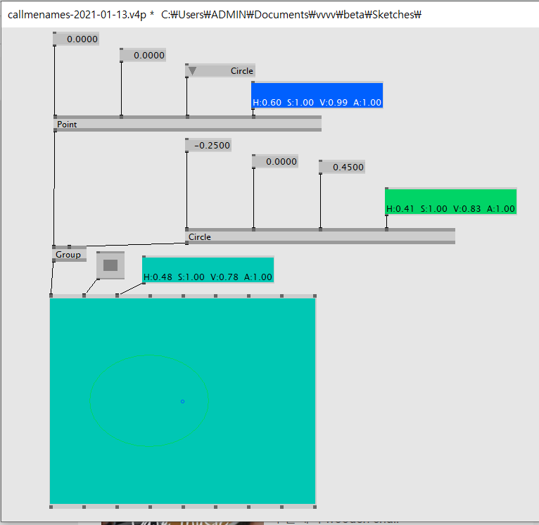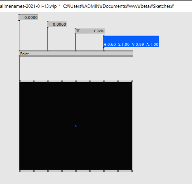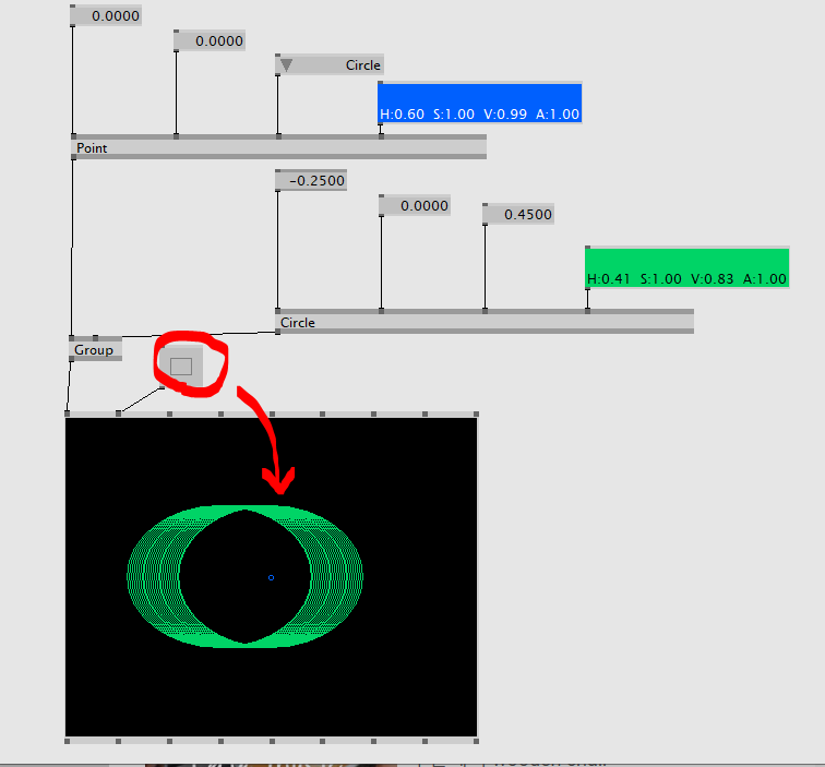 먼저 GDI Renderer는 처음에 삽입하면 개별 창으로 뜬다. 이럴 경우 한눈에 잘 안보이기 때문에 ALT + 2 를 눌러 VVVV안에 Renderer 창을 삽입 할 수 있다. renderer 창이 띄워지면 창 안에 이미지를 표시하는데는 다른 노드가 필요하다. 기본적인 이미지 표현 노드로 Point 노드와 Circle 노드가 있다. 포인트 노드의 인풋핀을 조절해 포인터의 위치 / 모양 / 색깔을 바꿀 수 있다.