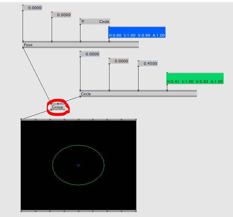 Renderer의 이미지 인풋핀(첫번째 핀)이 한 개 이기 때문에 그냥 연결해서는 동시의 두 개의 모양을 출력할 수 없다. 두 개의 모양을 동시에 출력하고 싶을 경우 Group 노드를 사용한다.