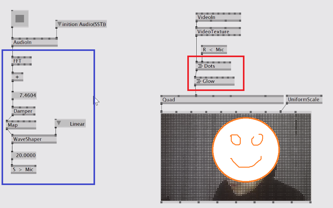 위 작품은 AudioIn 을 통해 받아드린 마이크 데이터 값을, VideoIn 을 통해 들어온 웹캠 영상의 필터값을 바꾸는데 활용해 외부 소리에 반응하는 영상이다. 파란색 네모 부분의 노드들 (FFT / + / Damper / Map / WaveShaper) 은 마이크에서 인풋된 데이터값들을 다듬는 노드들이다. 보다 자연스러운 영상미를 위해서 데이터 값을 다듬는 부분은 매우 중요하다.