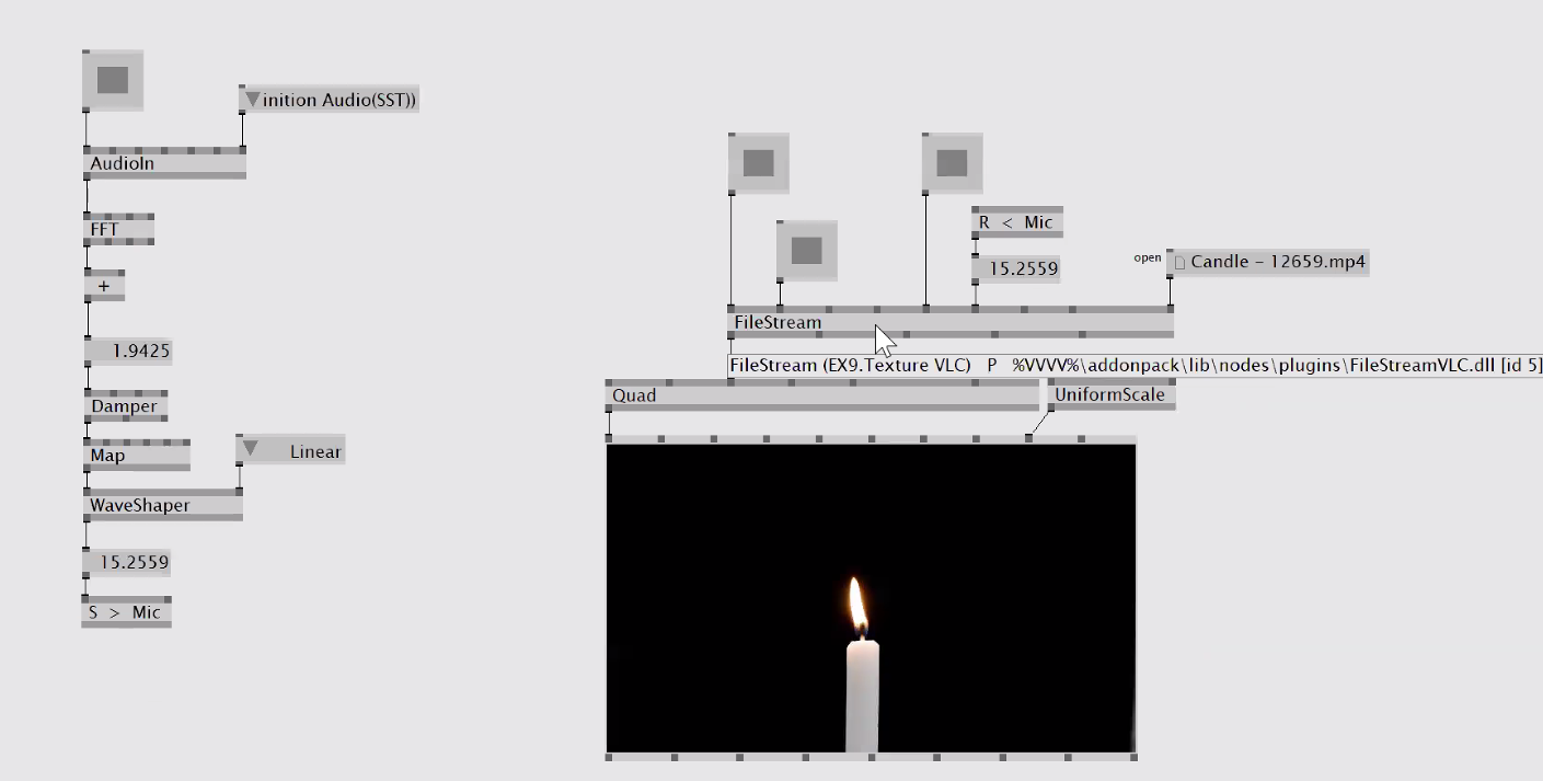 이 작품은 마이크에 대고 후! 하고 불면, 초가 일렁이는 영상에서 초가 꺼지는 영상으로 바뀌는 작품이다. 처음 이 작품을 봤을 때 어떤 효과를 주는 노드를 썼을까? 궁금했는데, 확인해보니 시각적 효과를 주는 노드는 사용하지 않았다는 사실이 놀라웠다.