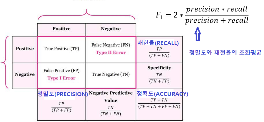 이를 바탕으로 분류 모델의 성능을 평가하는 <<각종 점수>>를 산출할 수 있다.