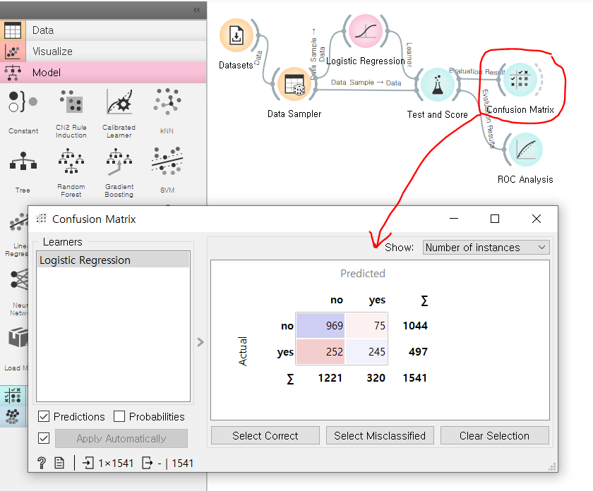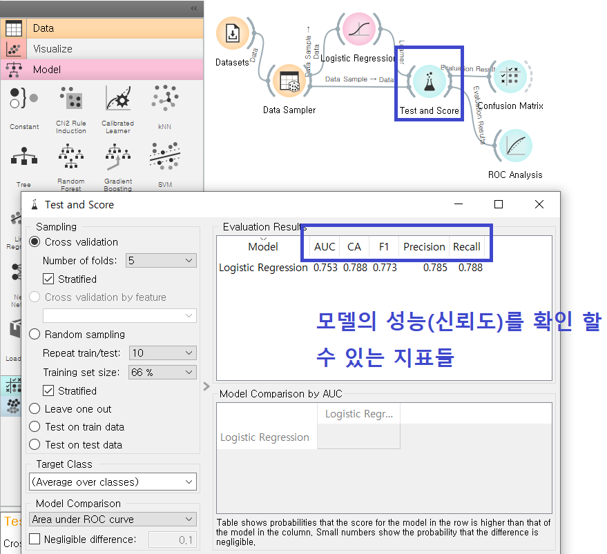 여러 모델 중 최적의 모델을 확인하는 위젯이 바로 Test and Score 위젯이다. Test and Score 위젯을 활용하면 모델의 성능(신뢰도)를 확인할 수 있는 AUC / CA(정확도) / F1 score / Precision(정밀도) / Recall(재현율) 등의 지표를 확인할 수 있다. 뭐가 어렵다면 그냥 위의 숫자들이 1에 가까울수록 성능이 좋은 최적화 모델이라는 것만 알면 된다^^