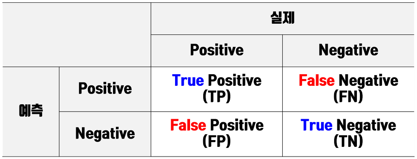 TP는 맞다고 예측하고 실제로도 맞은 경우 / FN은 맞다고 예측했는데 아닌 경우 / FP는 아니라고 예측했는데 맞은 경우 / TN은 아니라고 예측했는데 아닌 경우이다. 즉 TP/TN은 높을수록 FP/FN는 낮을수록 성능이 좋은 모델이다.