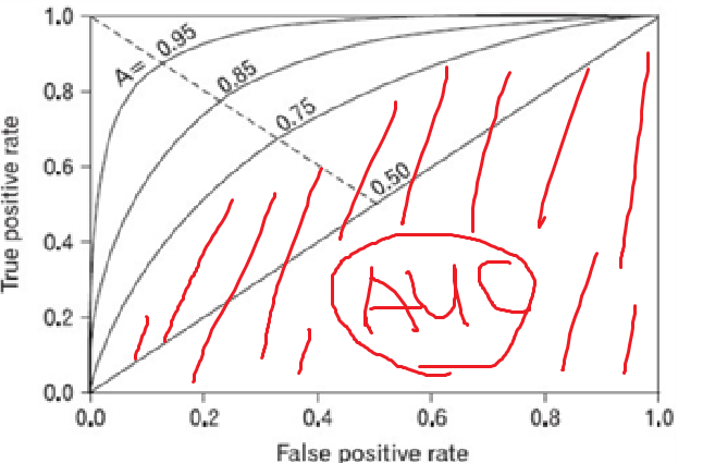 위의 그래프를 ROC 곡선이라고 한다. 이는 민감도(TPR)와 거짓참판정 비율(FPR)을 평면위에 나타낸 것이다. 성능이 좋은 모델은 민감도가 높을 것이기 때문에 위와같이 좌측상단쪽으로 붙는 그래프일수록 더 최적화된 모델이라는 것을 알 수있다. AUC란 Area Under ROC curve 의 약자로 ROC 곡선과 X축이 만드는 공간의 넓이를 말한다. 당연히 AUC의 크기가 클수록 최적화된 모델이란 것을 알 수 있다.