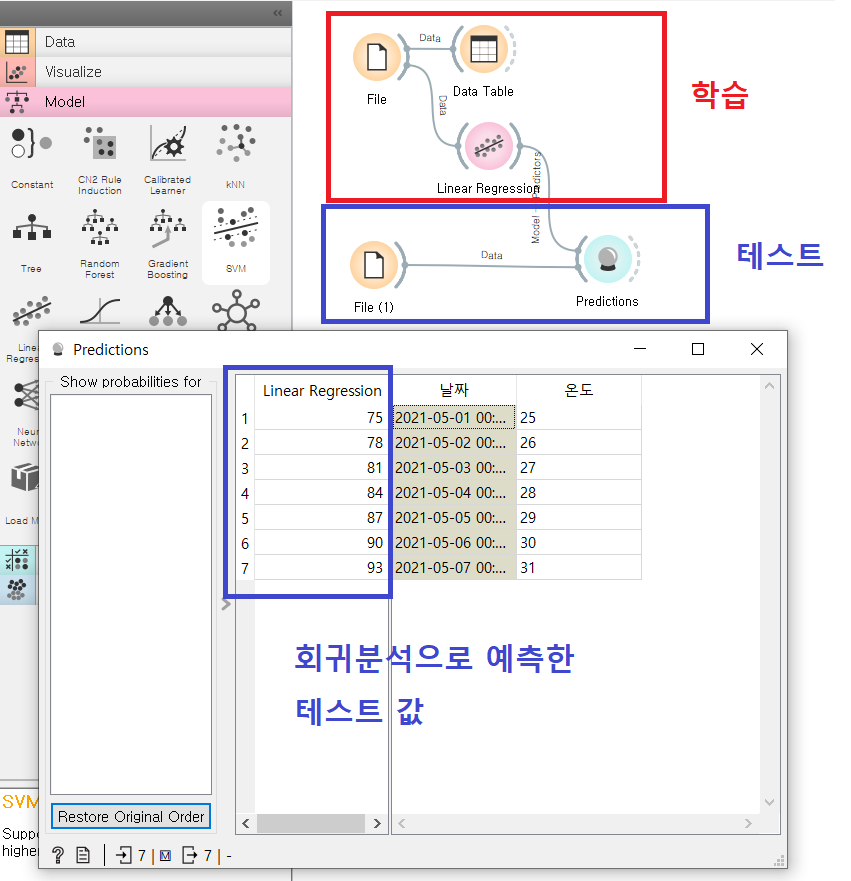 Predictions 위젯을 활용하여 선택한 모델에 의한 예측값과 실측값을 비교하고 그 정확도를 확인할 수 있다.