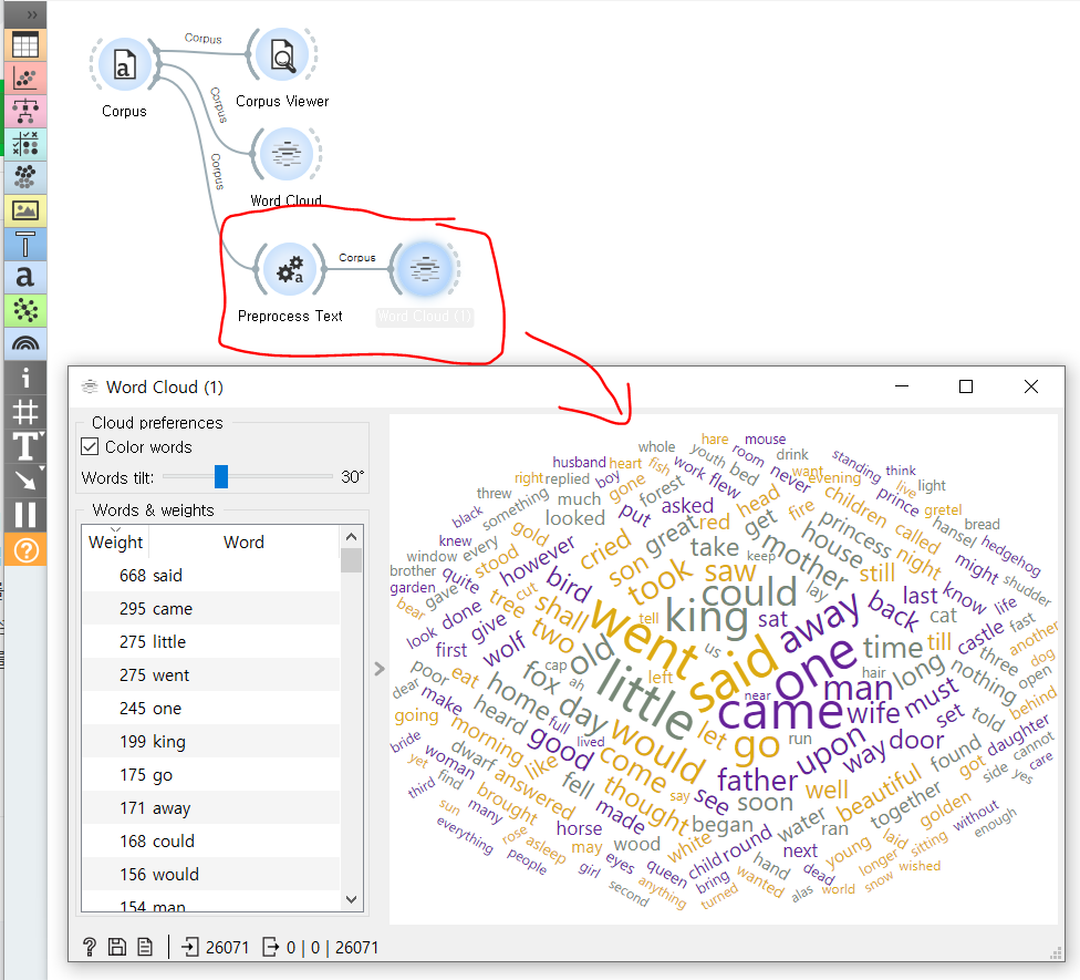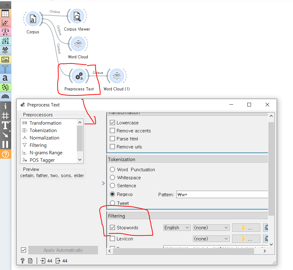 Preprocess Text 를 활용해 불용어를 제거할 수 있다. 이외에도 텍스트 전처리의 다양한 파이프라인(n-gram / 필터링 / 정규화)을 구성할 수 있다. stopwordlist.txt 파일을 만들어 직접 stopword 리스트를 만들 수 있다.
