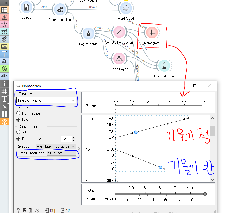 보다 적합한 모델로 판명된 로지스틱 회귀의 분류 결과를 알아보기 위해 노모그램을 연결했다. 노모그램에 총 12개 키워드에 대한 중요도가 나타나 있다. 2d 커브로 표현하면 저렇게 정비례 기울기 값과 반비례 기울기 값으로 나뉜다. 정비례인 키워드는 타겟 클래스(tales of magic)에 대해서 중요도가 높다는 뜻이고 / 반비례인 키워드는 타겟 클래스에 대해서 중요도가 낮다는 뜻이다.