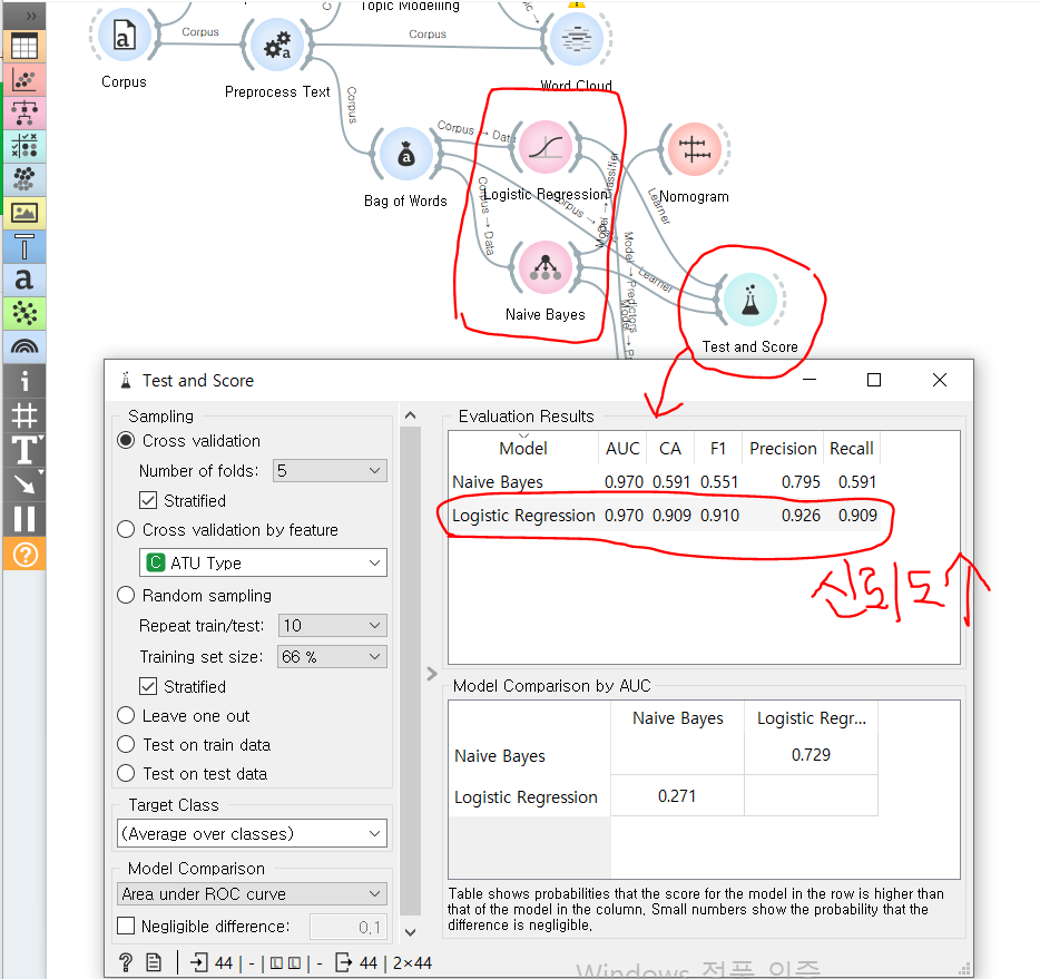 로지스틱 회귀와 나이브 베이스 위젯을 활용해 문서를 분류 처리하고 그 결과를 test and score 위젯으로 비교해본다. 각종 score를 비교해봤을 때, 위의 데이터에는 로지스틱 회귀 방식이 더 적합함을 알 수 있다.