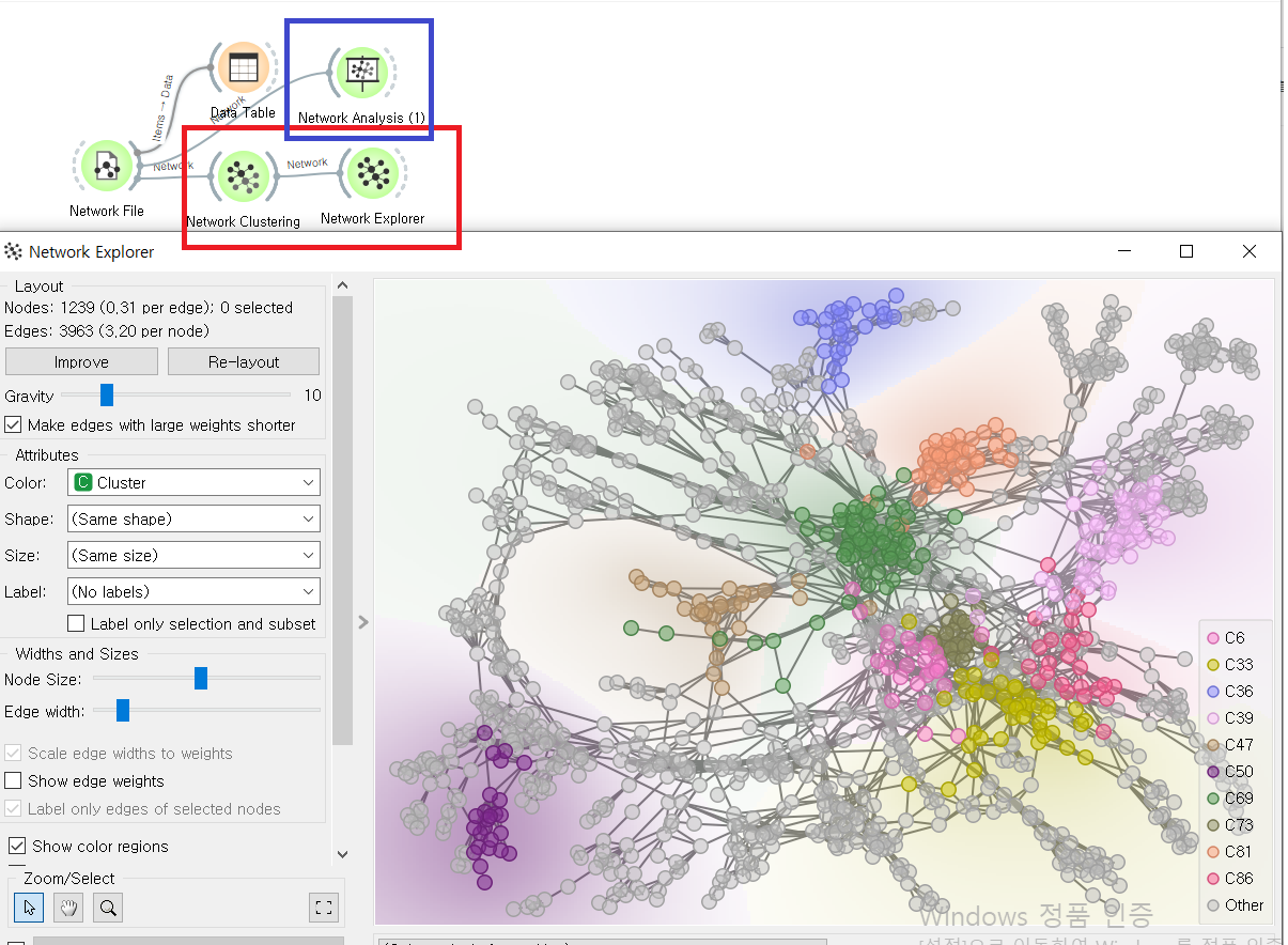 -가장 기본인 네트워크의 시각화를 위해선 2가지 위젯이 필요하다. Network Clustering은 네트워크에서 커뮤니티를 감지해 cluster를 형성한다. Network Explorer 는 네트워크와 해당 속성을 위와 같이 시각화 한다.