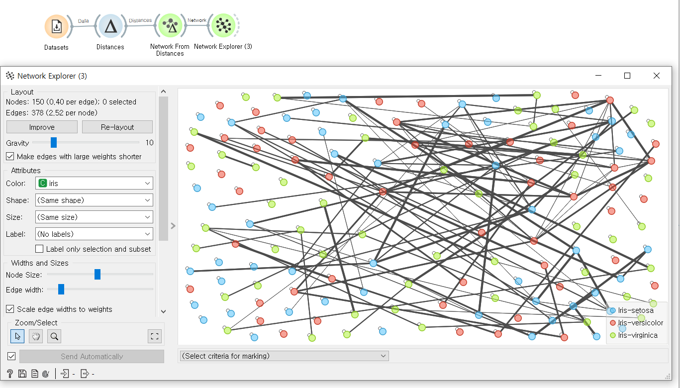 -군집화 위젯인 Distances 와 함께 활용하면 네트워크 형식이 아닌 파일도 떨어진 거리를 구해 유사도에 따라 노드의 연결성을 시각화 할 수 있다.