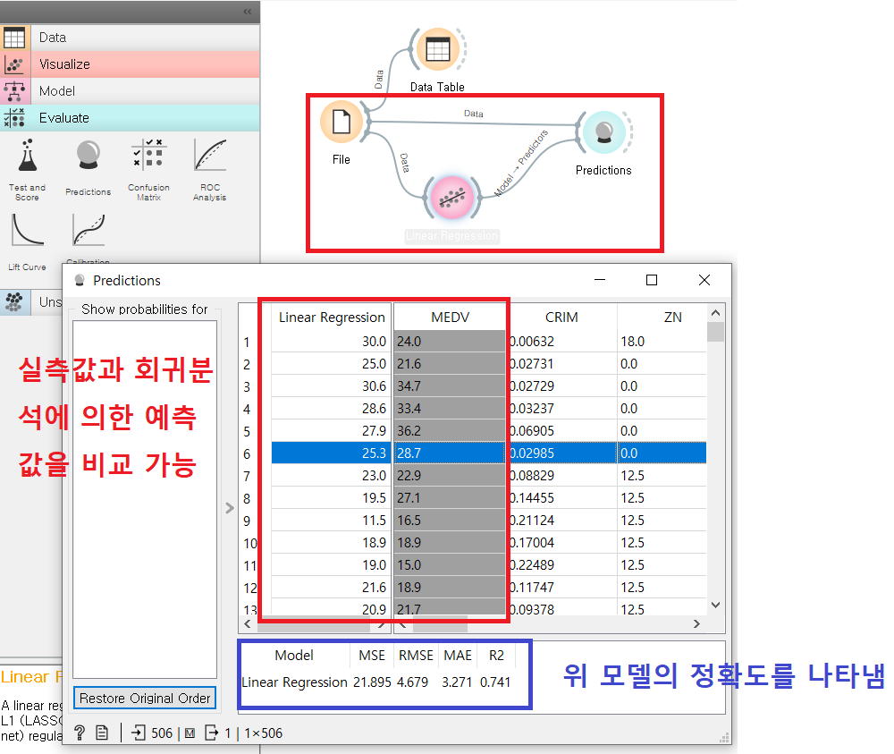 Linear Regression 선형 회귀분석을 이용할 경우, Prediction에 이렇게 방금 본 지표들이 나온다! 여러개의 모델을 넣으면 저 지표들을 활용해 최적의 모델을 선택할 수 있다.