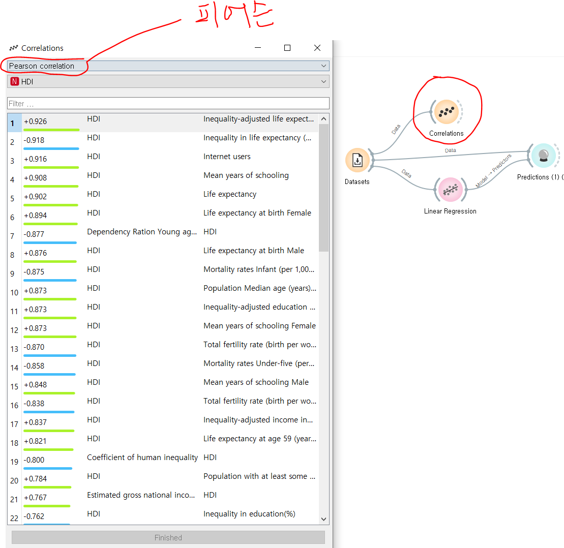 -서로 다른 변수들 사이에 어떤 상관관계를 가지는지 파악해야할 때가 있다. 그럴 땐 Correlation 위젯을 사용하면 된다. 피어슨 상관 계수와, 스피어만 상관 계수를 볼 수 있는데, 순서형 변수라면 스피어만 상관 계수를 참고한다.