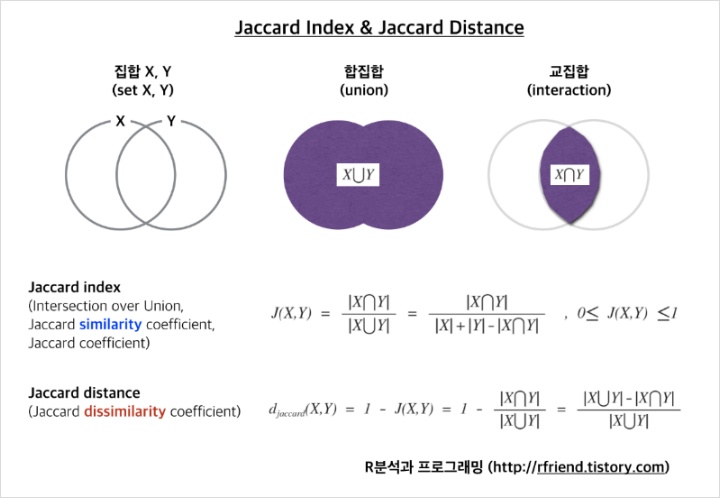 -자카드 거리 : 비유사성(여집합=합집합-교집합)의 정도를 표현 / 범주형 데이터에 사용