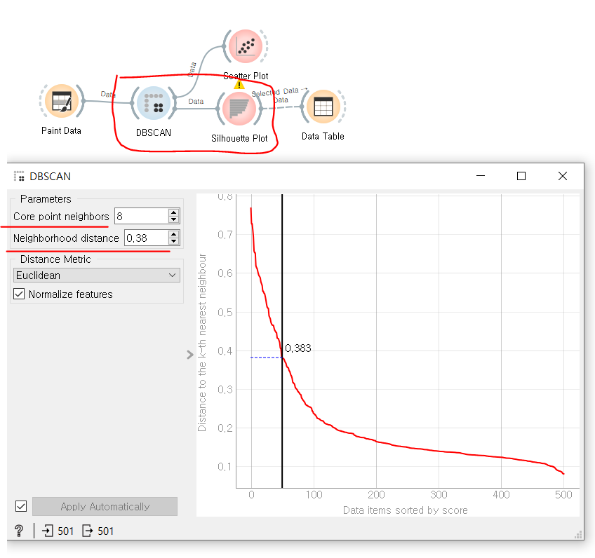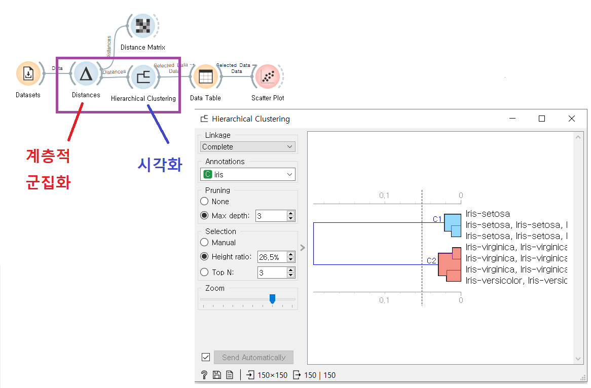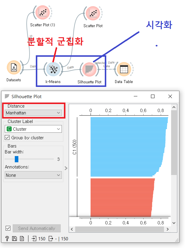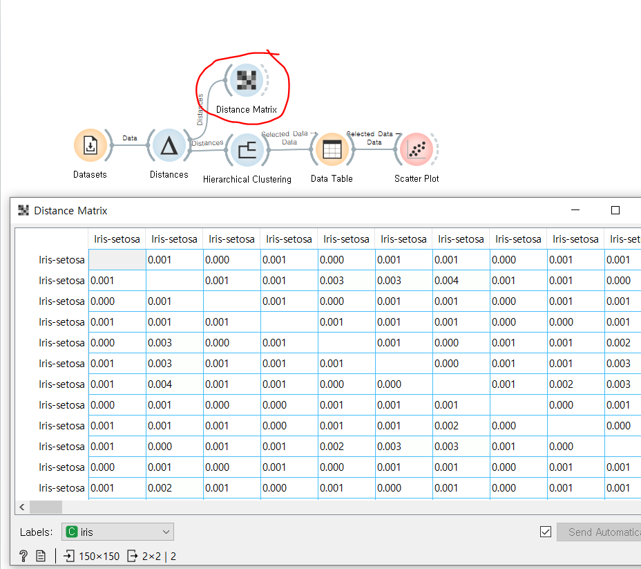 계층적 군집화에 활용되는 Distances + Hierarchical Clustering 위젯이다. 두개를 묶어서 세트로 활용하는 경우가 많다. distances 위젯이 군집화 데이터 처리를 한다면, Hierarchical Clustering 위젯은 시각화하여 보여준다. 현재 크게 2가지 군집으로 나뉜것을 볼 수 있다.