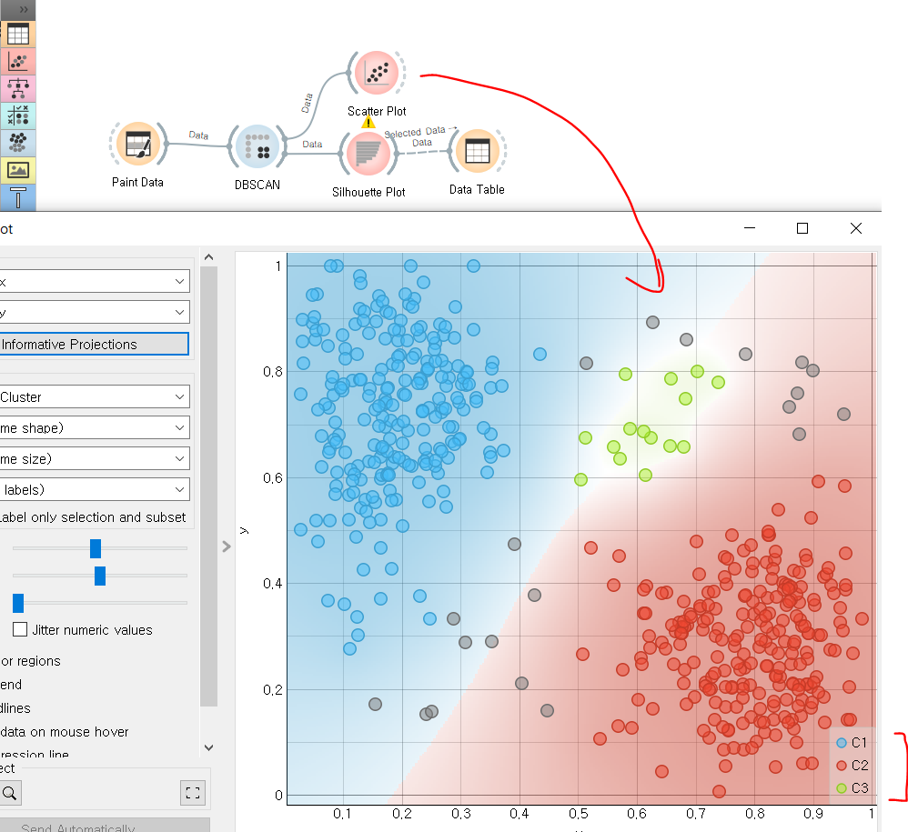 위는 DBSCAN 의 군집화 결과를 산포도로 나타낸 것인데, 현재 크게 3개의 군집으로 나눠진 것을 볼 수 있다.