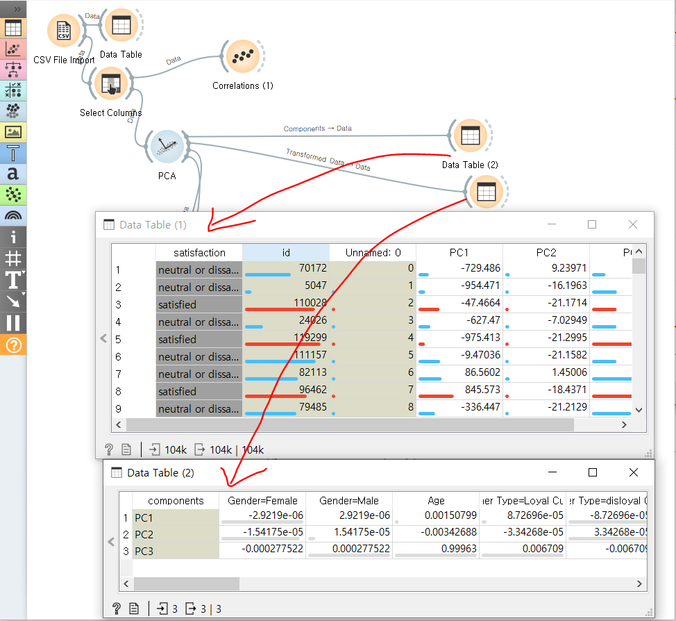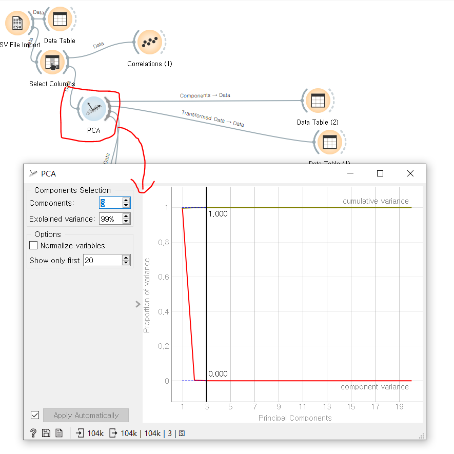 PCA를 사용해 대규모 데이터 세트의 시각화를 단순화활 수 있다. 또 PCA(주성분 분석)을 활용해, 원하는 갯수의 주성분을 구성하고 그 결과를 Data Table 로 확인할 수 있다.