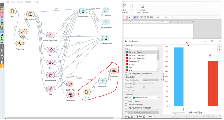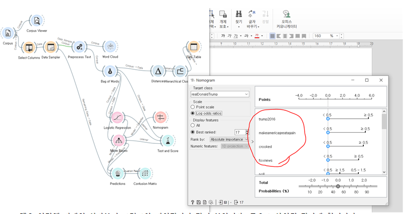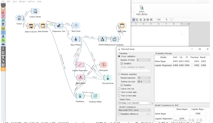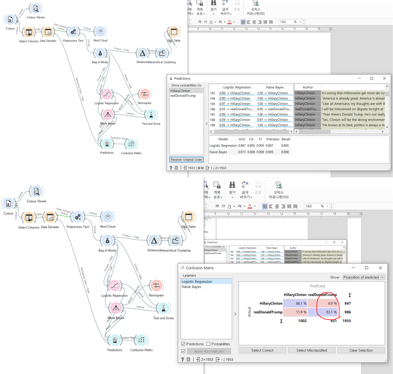 이제 처리된 데이터에 로지스틱 회귀와 naive bayes 위젯을 사용해 author를 구별하는 모델을 생성해보았습니다.