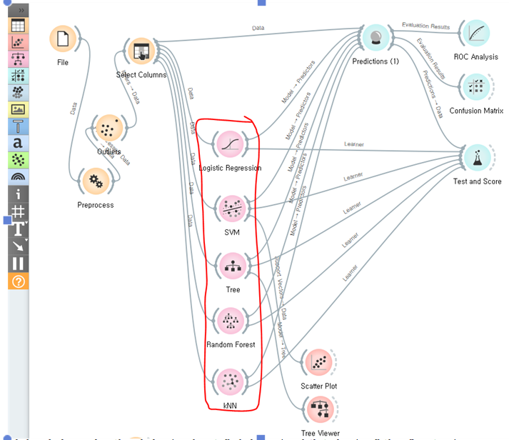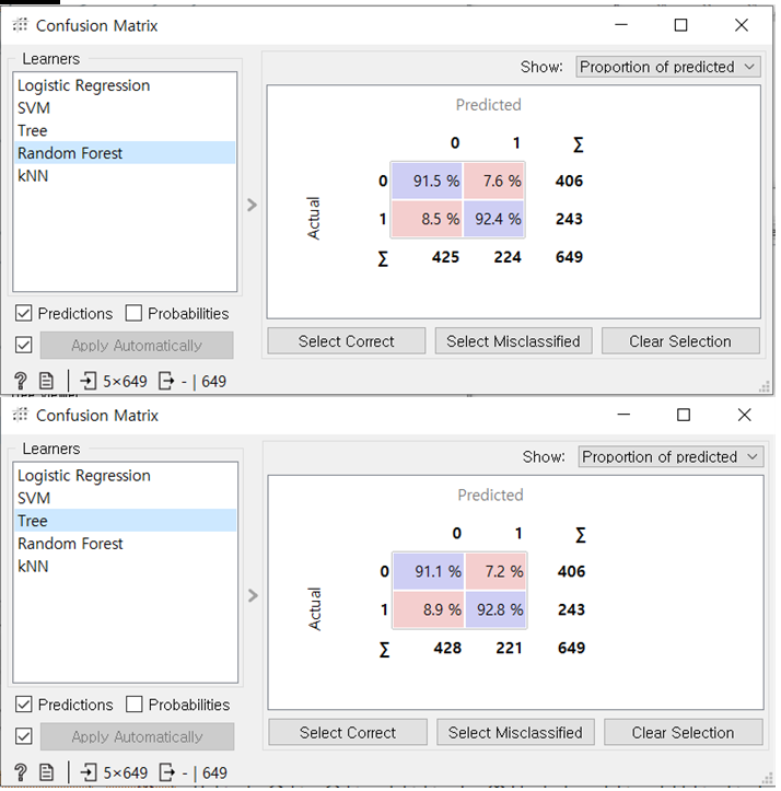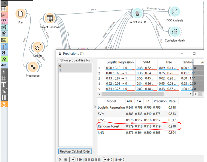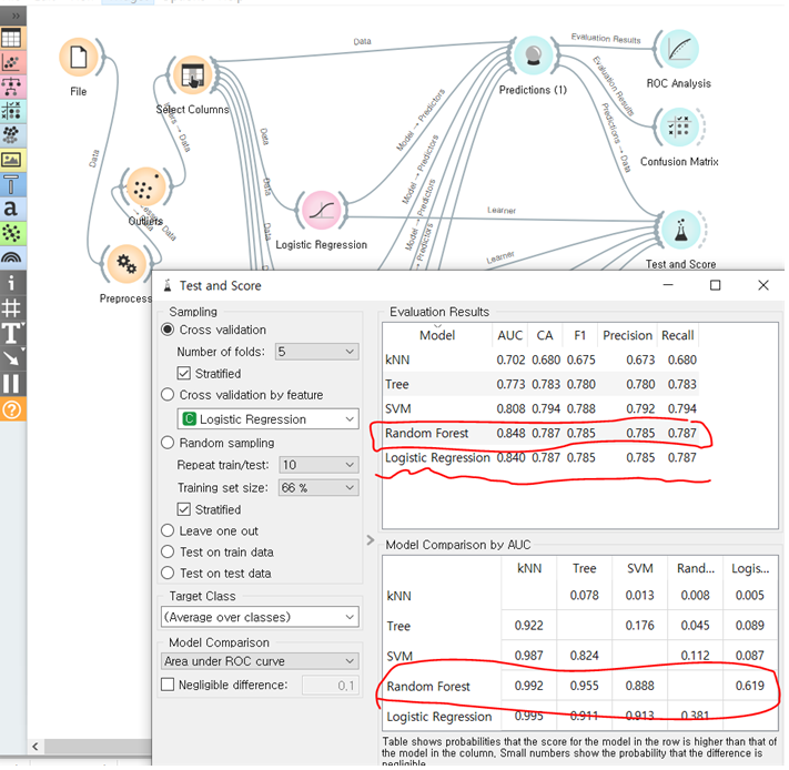 test and score 점수를 보아도 모델의 성능을 쉽게 비교할 수 있습니다. radom forest 모델이 나머지 네 모델이 비해서 AUC 영역 비교에서도 압도적 성능을 보입니다. 여기에선 TREE 모델의 성능이 저조합니다. 오히려 비교대상은 로지스틱 회귀 모델이었지만, 그래도 6:4 정도로 앞서고 있습니다. 따라서 하나만 사용해야 한다면 랜덤 포레스트 모델을 사용하는 것이 확률적으로 최적일 것입니다.