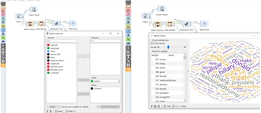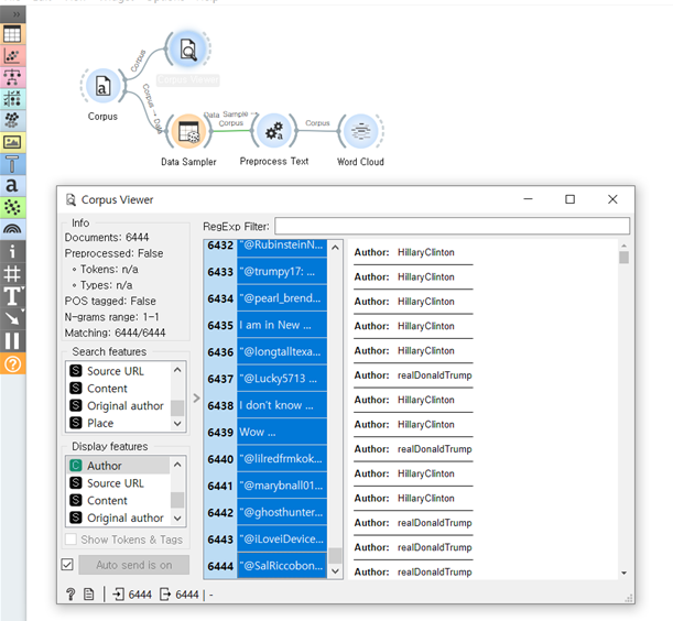 제가 고른 데이터는 2016 미국 선거 트럼프 vs 힐러리 트윗데이터입니다. 6444개의 텍스트 데이터로 되어있고 작성자는 2명 힐러리 / 트럼프입니다.