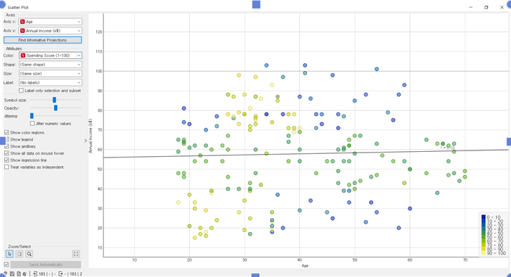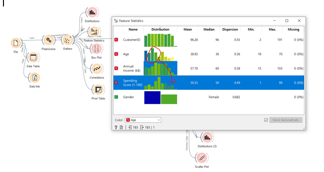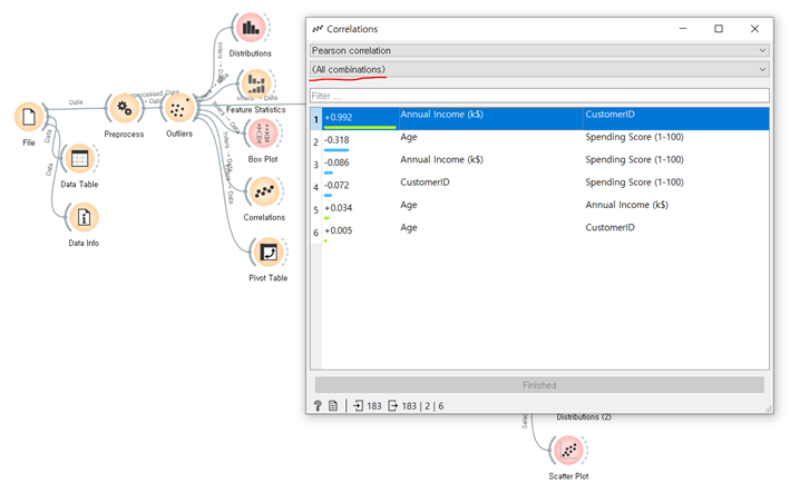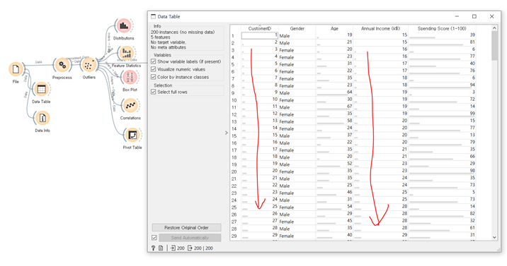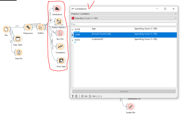 현재 위와 같이 간단하게 EDA를 진행해 데이터 군집화를 하기 전 데이터에 대한 INSIGHT를 구해보았습니다. 가장 특이했던 점은 Correlation 위젯을 통해 feature간 상관관계를 보았을 때, 밀접한 상관관계가 없었다는 점입니다. 그나마 age 가 피어슨상관계수로 –0.3 정도였습니다. 이것은 약한 정도로 나이가 적을수록 많은 소비를 했다 정도로 해석됩니다.