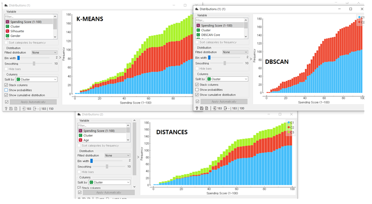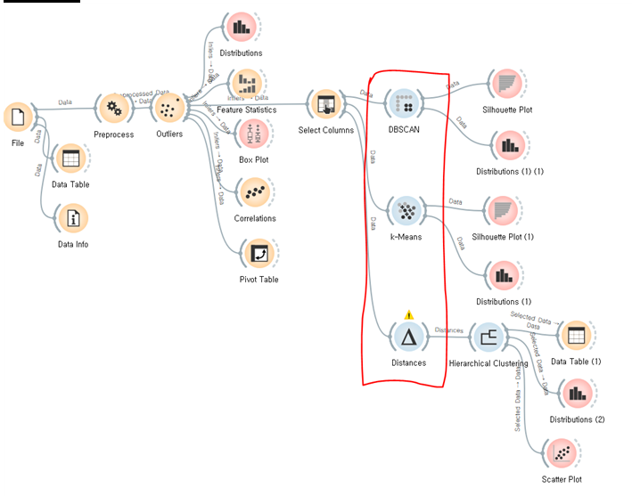 군집화 결과를 분포도 위에 표현해보았다. 각각 2~3개의 군집으로 나눠졌는데, 아주 유의미한 차이를 보이진 못하고 있다. 그나마 군집간 분리도가 선명한 것은 DISTANCES 위젯을 활용한 계층적 군집화이다.