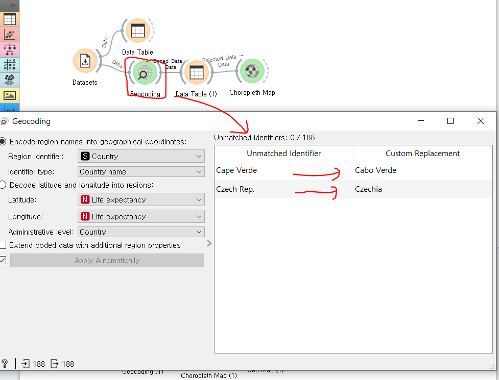 Geocoding 위젯은 등록된 고유명칭을 위도, 경도 값으로 바꿔준다. 이때 등록되지 않은 고유명칭이 나올 경우 위처럼 등록된 고유명칭으로 바꿔줘야 컴퓨터가 인식할 수 있다.