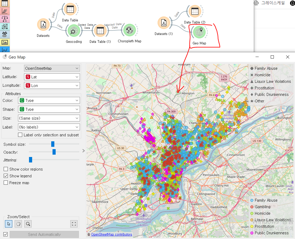 이 위젯은 세계지도에 데이터 점을 표시한다. 이렇게 간단하게 지오코딩에 대해 알아보았다. 다른 부분들에 비해 매우 간단하고 느껴지는데 그건 그만큼 오렌지3에서 이 부분을 잘 지원하지 못한다는 뜻으로 느껴진다.