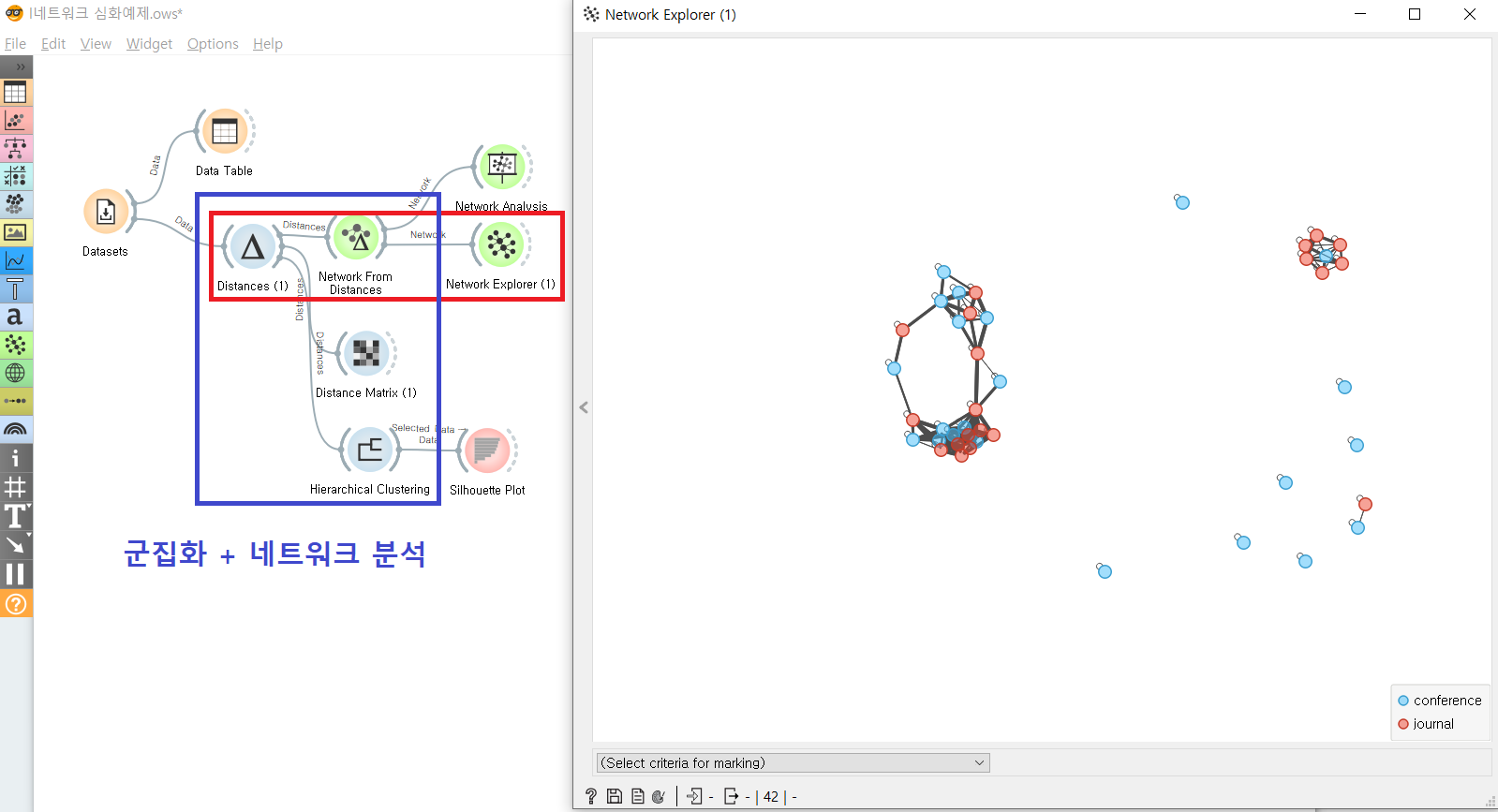 네트워크 분석은 군집화와 연결성이 좋다. 일반적인 데이터도 Distances(계층적 군집화 모델)로 instance간 거리(유사도)를 수치화하면, 네트워크 위젯으로 분석하고 표현할 수 있다. 또한, Distances 위젯으로 분석했기 때문에 Distance Matrix나 Hierarchical Clustering 위젯 등으로 시각화 할 수도 있다.