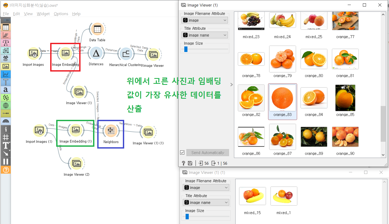 일반적인 이미지 상태에선 어떤 분석도 할 수 없다. 컴퓨터는 숫자만 알아들으니까 숫자로 바꿔주는 작업이 임베딩. 위의 분석 모델은 두 이미지 데이터군을 모두 임베딩한 후 Neighbors 위젯으로 인접한 2개의 이미지를 고르게 해주는 시스템이다. Image Embedding 과 Neighbors 위젯의 연결을 기억하자.