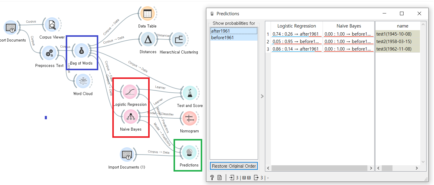 1961년 전후의 연설문 데이터를 가지고 Bag of Words 위젯으로 단어 빈도를 추출한 후, 두가지 분석모델(로지스틱 회귀, 나이브 베이스)을 활용해 분석하고 그 결과로 새로운 데이터가 1961년 전인지 후인지를 예측해보는 데이터 마이닝 모델이다. 자연스러운 분석 모델 워크 플로우다.