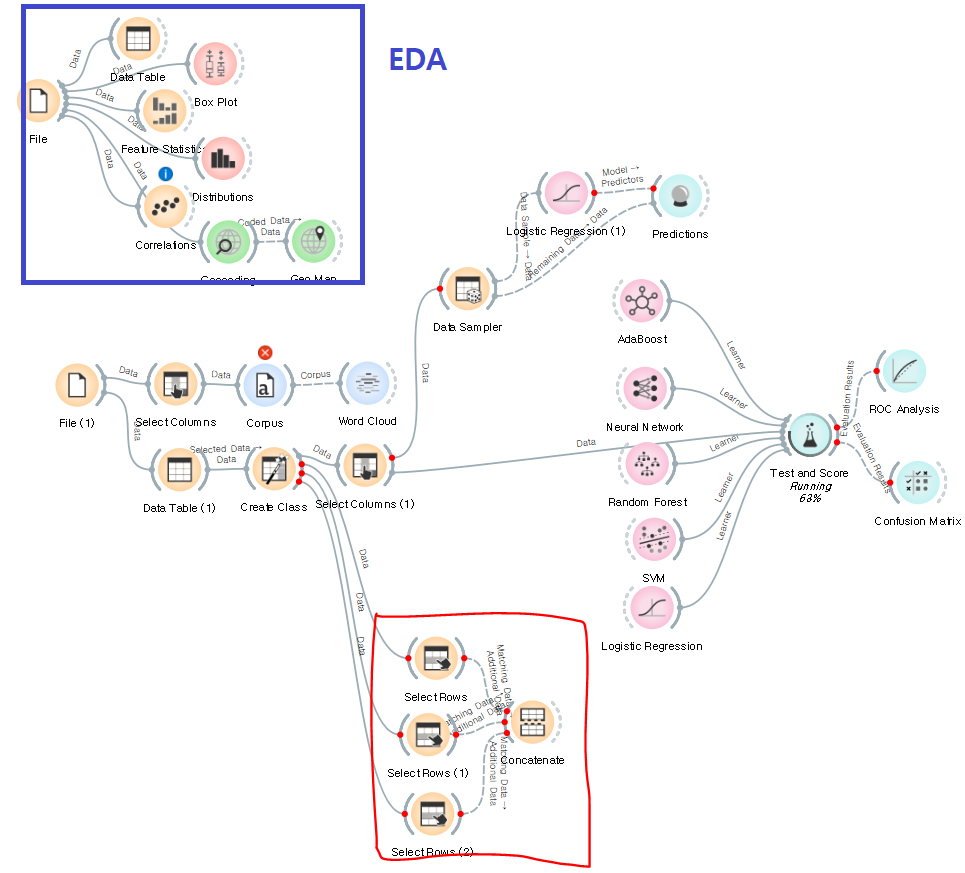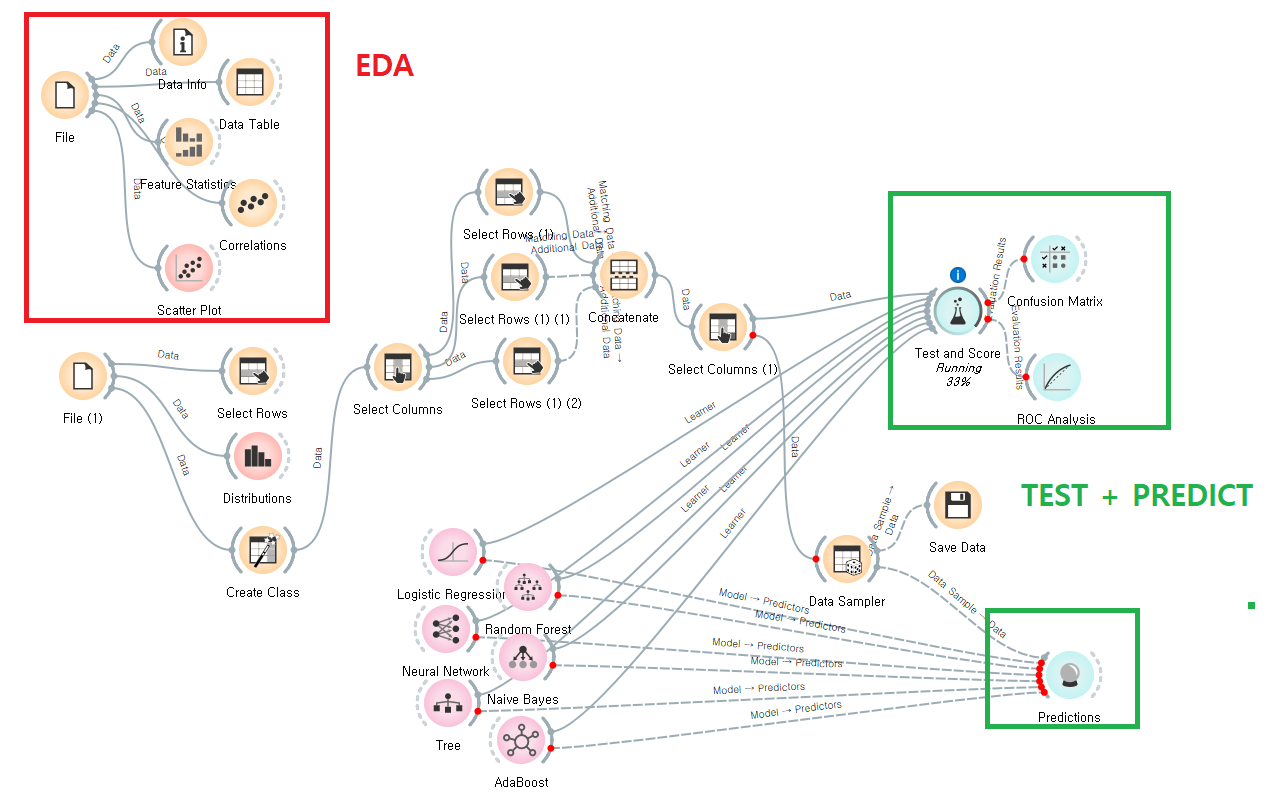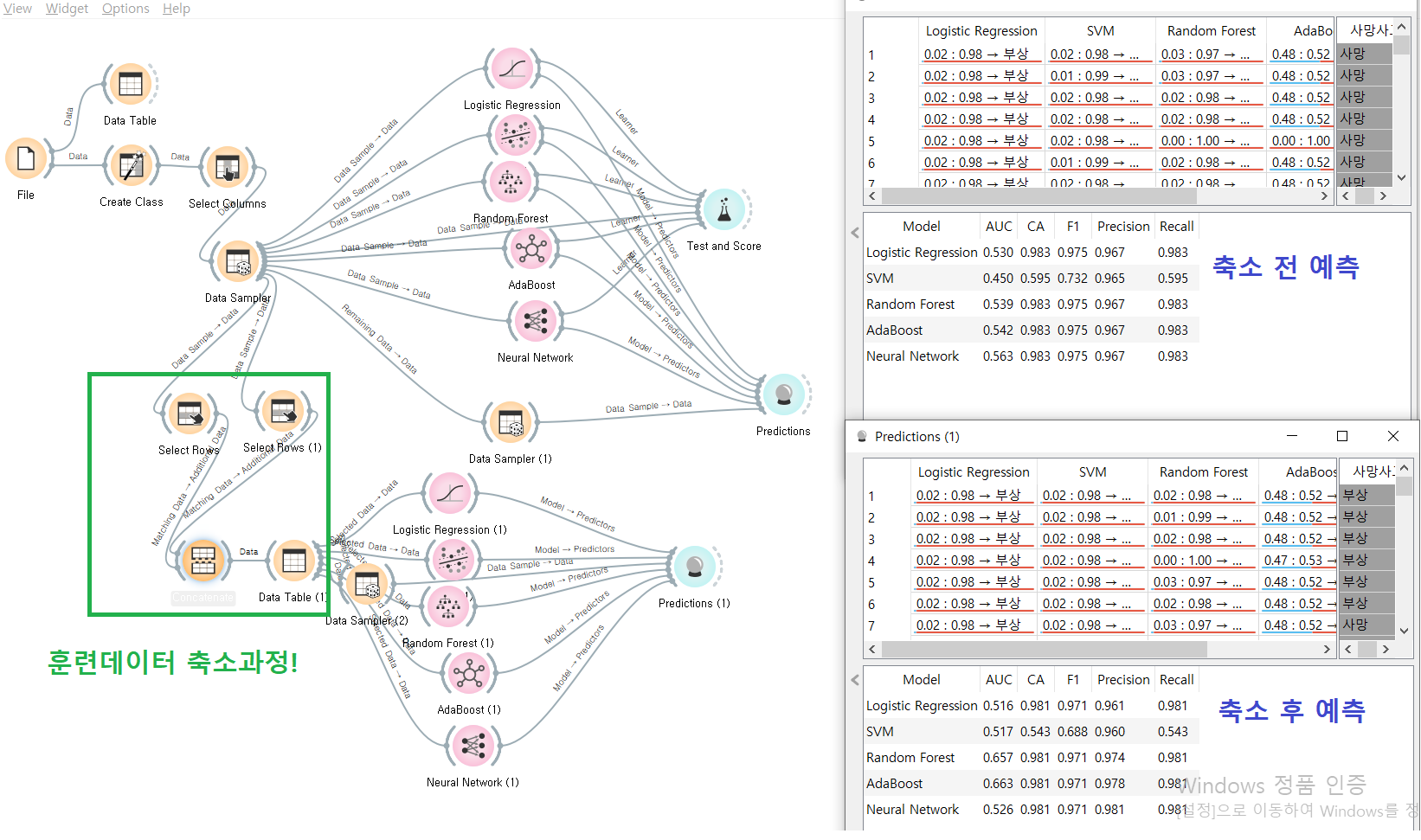 -이 과정에서 Select Rows + Concatente 위젯이 사용된다. 그 결과를 바로 위 사진에서 찾아볼 수 있다. 훈련데이터 축소 후 전반적으로 모델의 성능이 나아졌다.