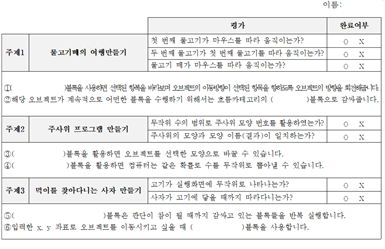 실제 평가를 할 때 사용할 평가지, 루브릭(이원목적분류표) 등을 만드는 단계이다. 아래의 예시처럼 자신이 학습한 내용(앤트리)에 대해 복습하며, 활동 여부를 스스로 점검할 수 있게 완료여부를 체크하도록 하면 학습 반성의 의미도 더해지게 된다.
