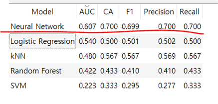 이후 오렌지 프로그램을 통해 인공신경망(Neural Network) 알고리즘으로 이미지 분석을 실시하였다. 테스트 결과 인공신경망 모델의 정확도가 약 70% 정도 되는 것으로 나타났다.