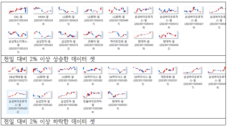 직접 수집할 수 있는 데이터 중, 면담이나 설문을 통한 데이터가 아닌 간단한 주가(주식의 가격) 데이터를 이미지화 하여 분석하기 위해 2% 이상 상승한 데이터 16개, 2% 이상 하락한 데이터 14개를 수집하였다. 데이터 전처리 과정을 거치며 주가를 나타내는 캔들만 남기고 나머지 노이즈(이동평균선, 거래량, 최저, 최고가 등)는 제거하였다.