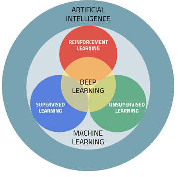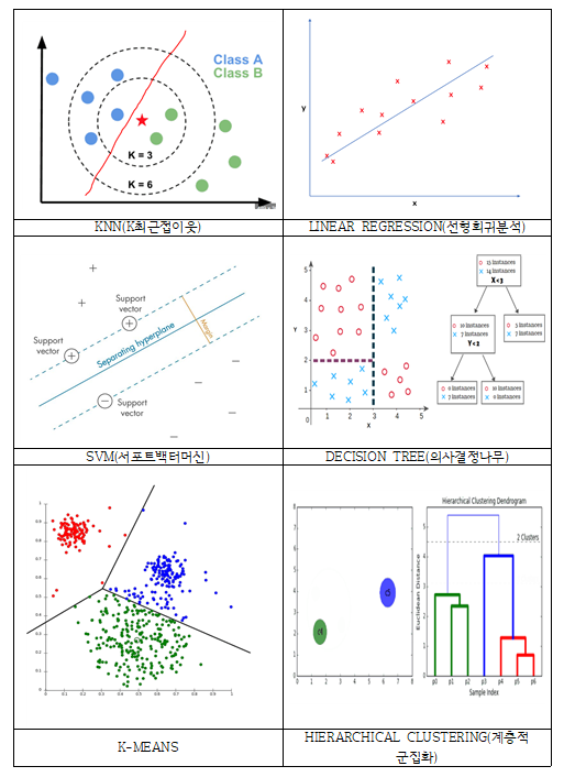 인공지능을 실현하기 위한 알고리즘으로 다양한 알고리즘을 들 수 있다. KNN(K최근접이웃알고리즘), SVM(서포트백터머신), 선형회귀분석, 로지스틱회귀분석, 의사결정나무, K-MEANS, 인공신경망 등 많은 알고리즘이 있다. 이런 알고리즘을 사용하는 학습을 지도학습, 비지도학습, 강화학습 등으로 나누기도 한다.